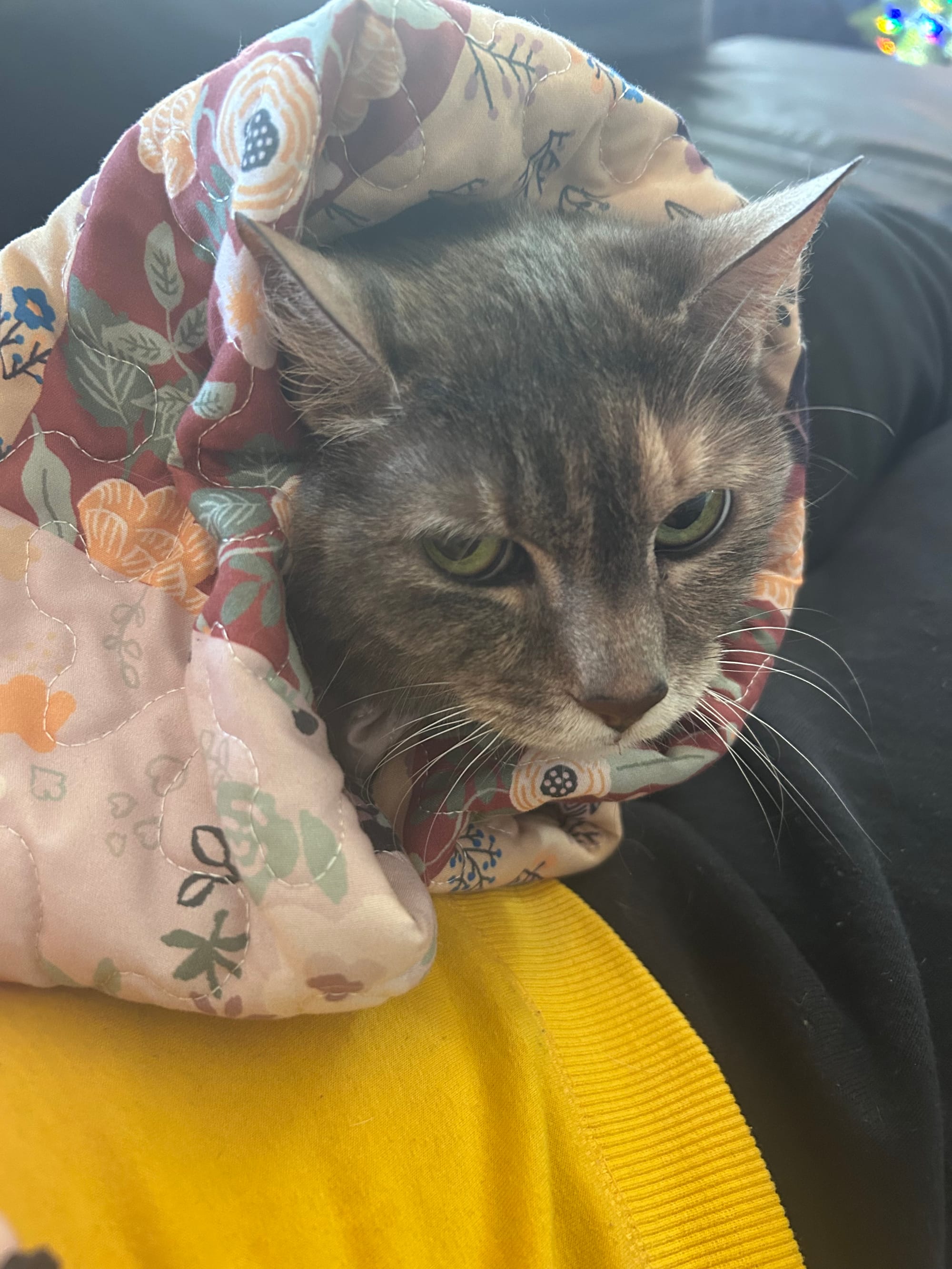 And Patience is still staked in front of the television maybe gawking a little over Colin Firth holding a very grumpy cat wrapped baby-style in a picnic blanket... possibly regretting her life choices a little according to her angry eyes...