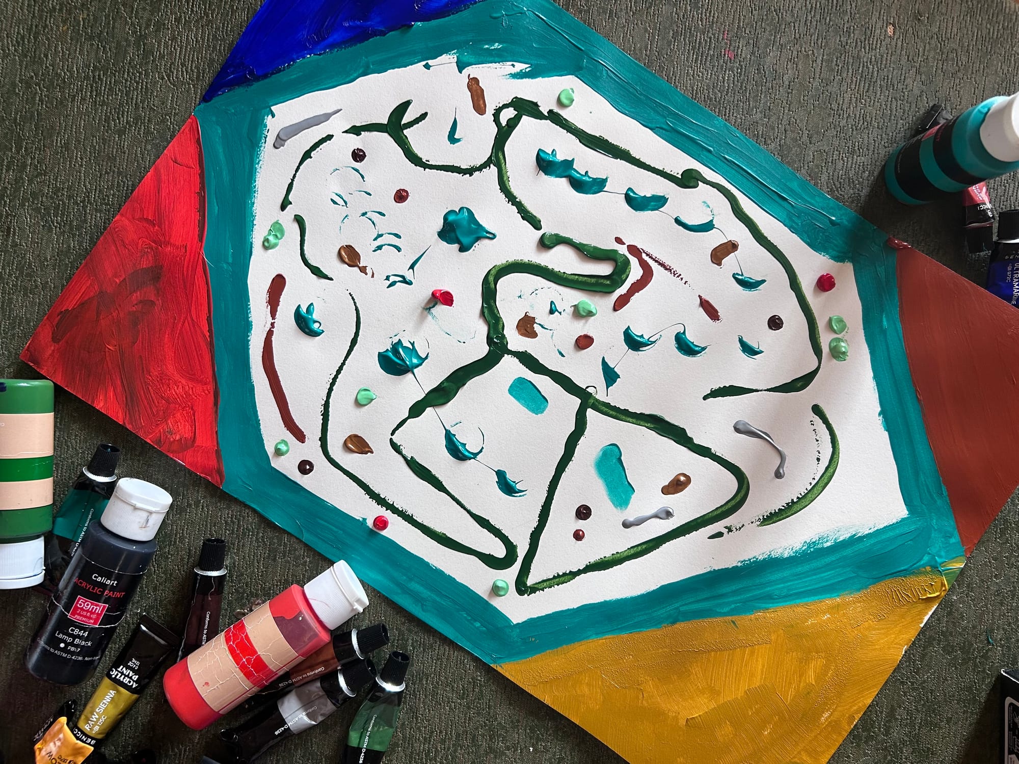 It's an Art Day for Patience... her former submission was apparently mistakenly trashed the previous week so she conjures something new for her contest entry as inspiration to Kevin Puts' Codes Mvt. II... the abstract is dotted and daubed in scarlet and sand and jade...
