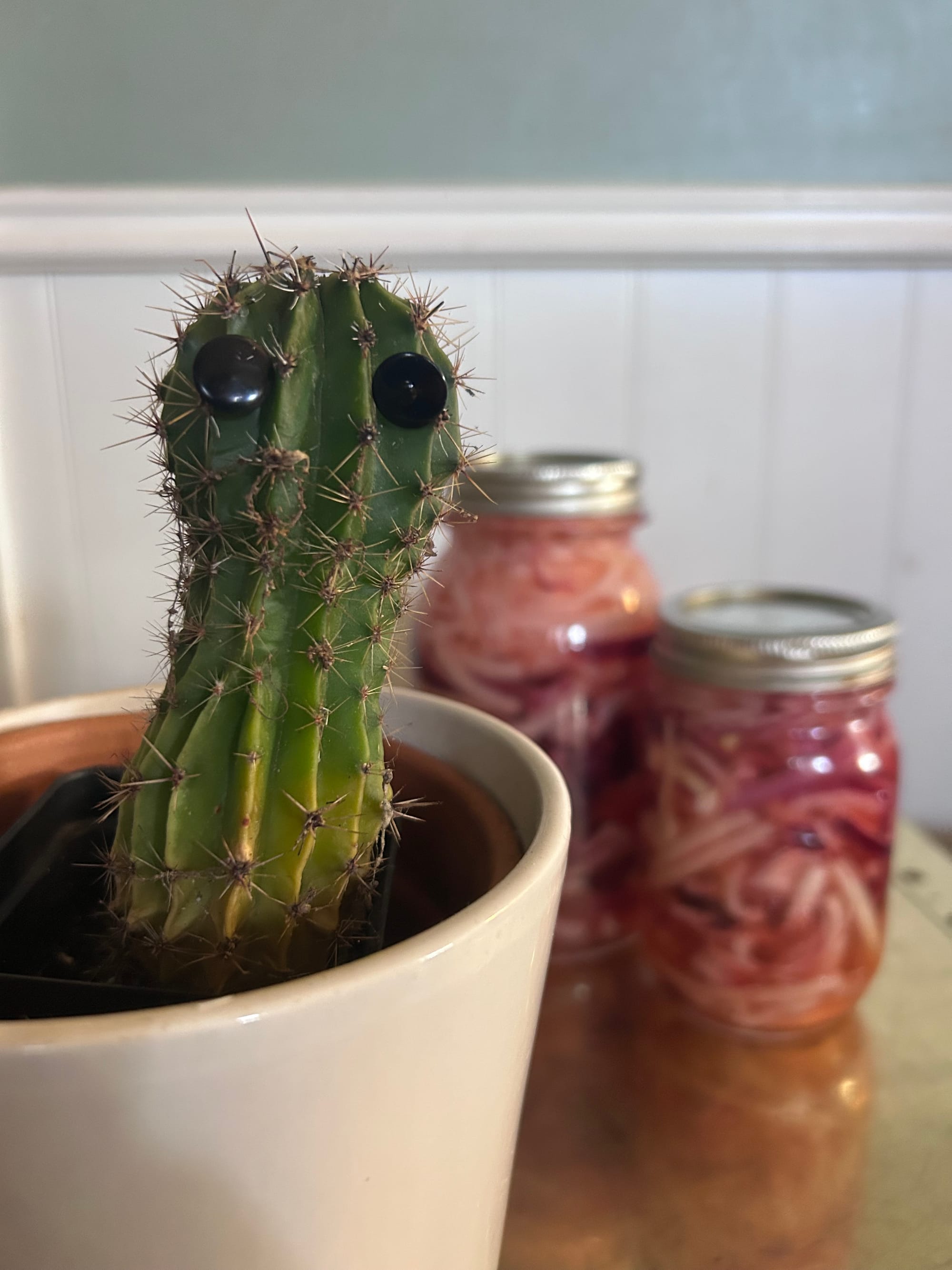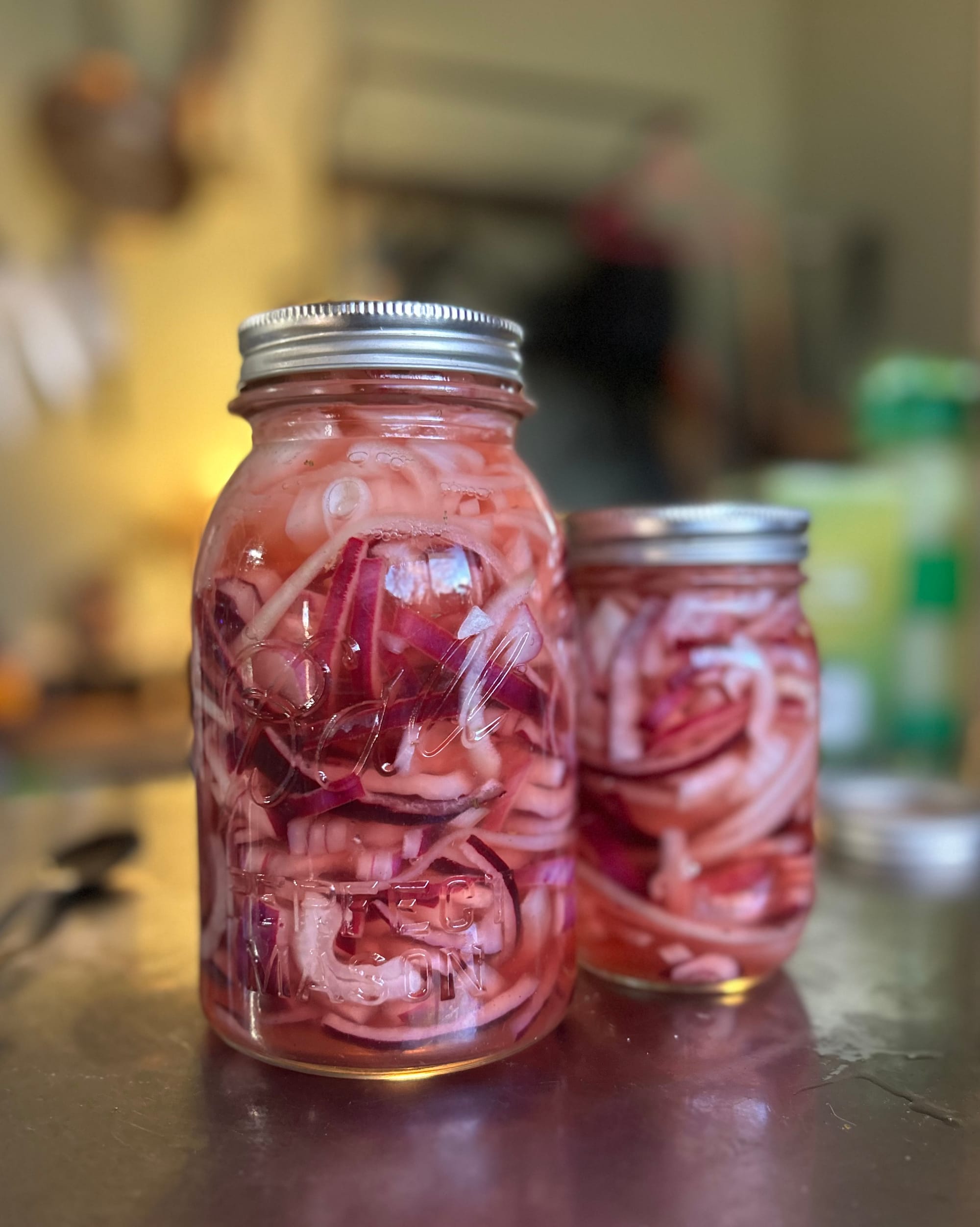 Oxbear is in the kitchen packing jars of homemade pickled onions looking like pink and white marble under glass...