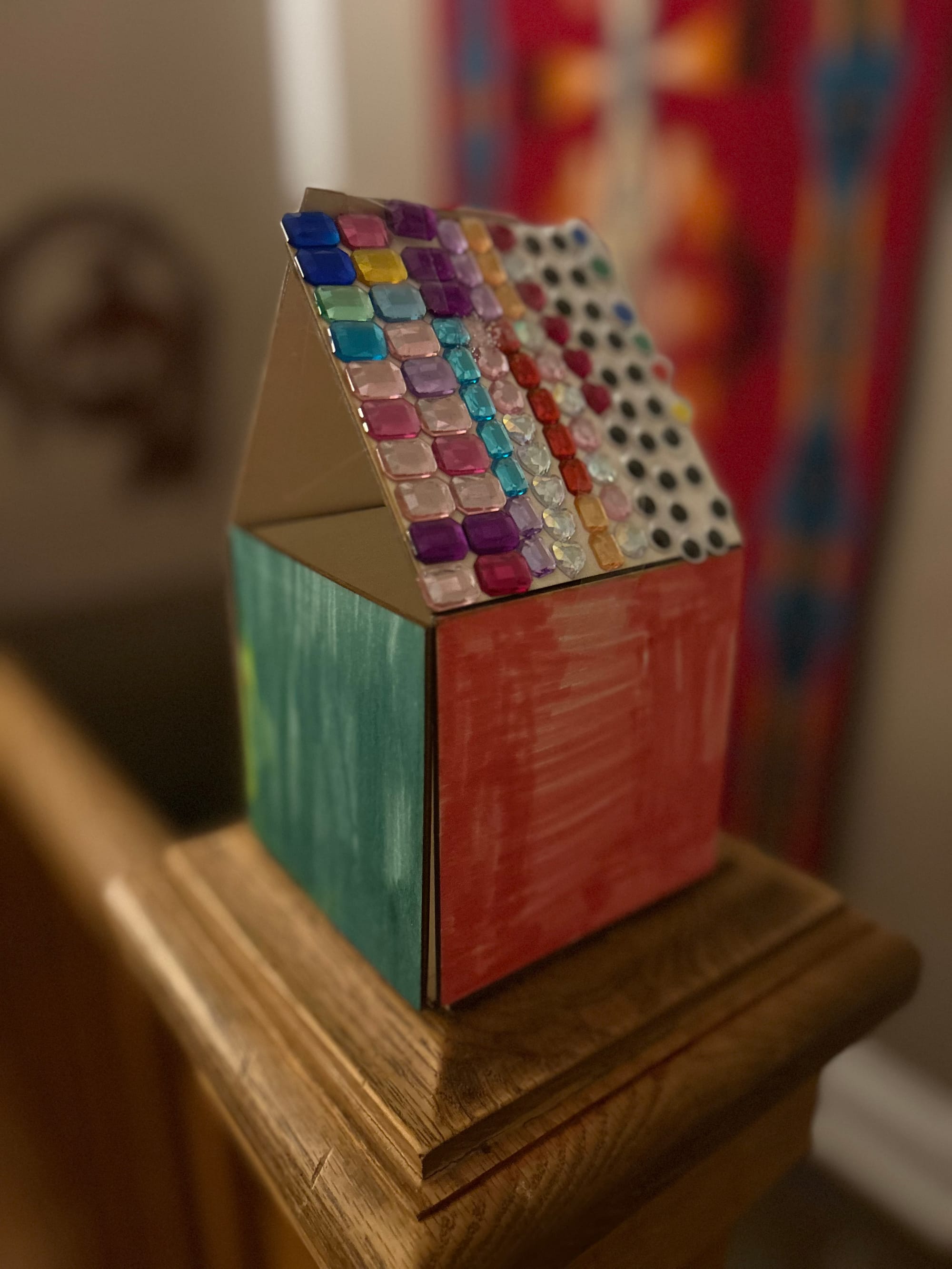 It's already a few hours later... sitting next to the wood hut Patience composed yesterday with a roof lined in rhinestones and googly eyes... kids have just finished learning about some of the various kinds of world maps (an absurdly high number of varieties)...