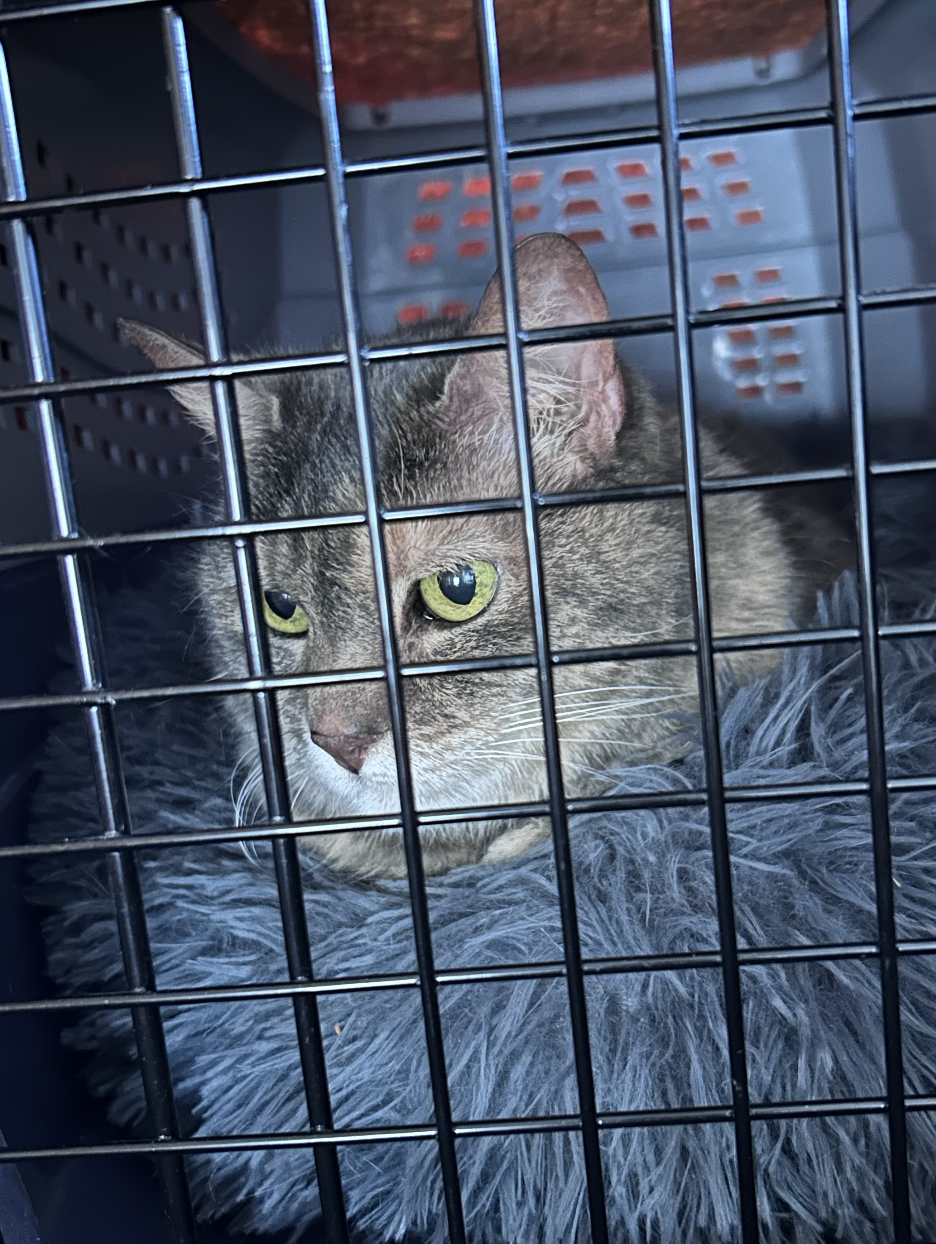 Back home to help box up the big grumpy gray thing for a vet appointment... she slides almost comfortably onto the fuzzy cushion Patience saved for her transport as Oxbear and Yali drive her off to what becomes about an hour and a half of waiting for a room...
