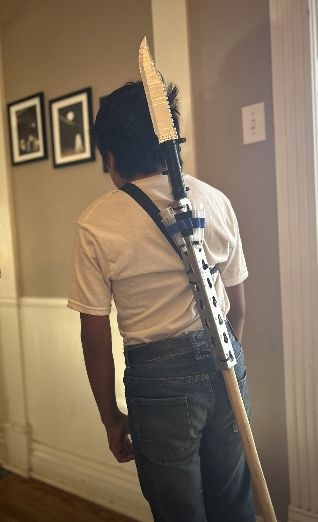 ...as Yali sleepily joins the table for a cream cheese bagel sandwich as he zip-ties a 3D-printed knife wrapped in metallic tape to a honeysuckle staff already wrapped in straps and plastic syringes for an upcoming film prop... “Yali? Are those cobwebs in your hair?”...