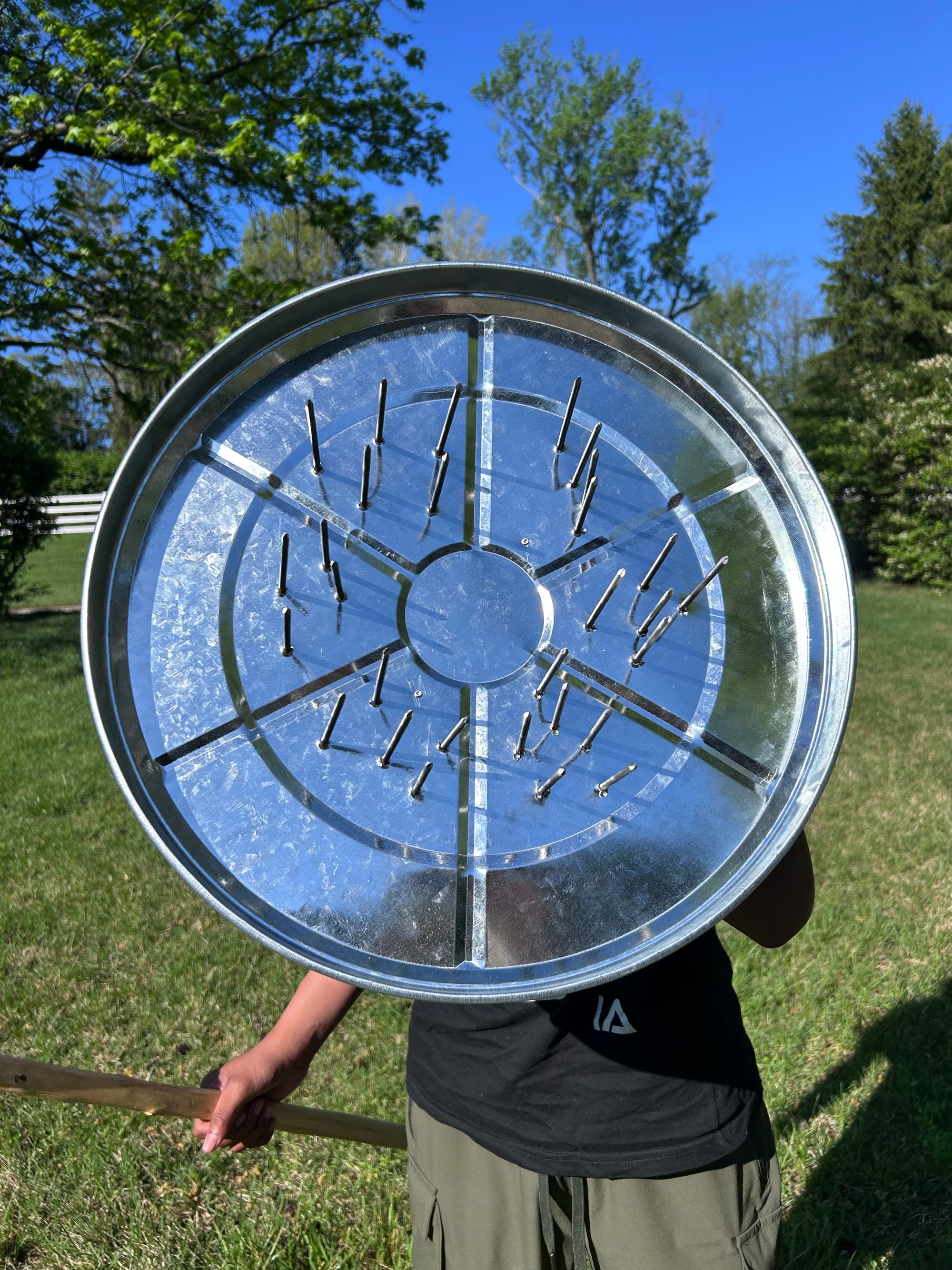 Yali meanwhile is whirling in careful poses around the living room... battle staff in one hand... metal garbage can lid studded with nails in the other... every movement is chosen carefully...