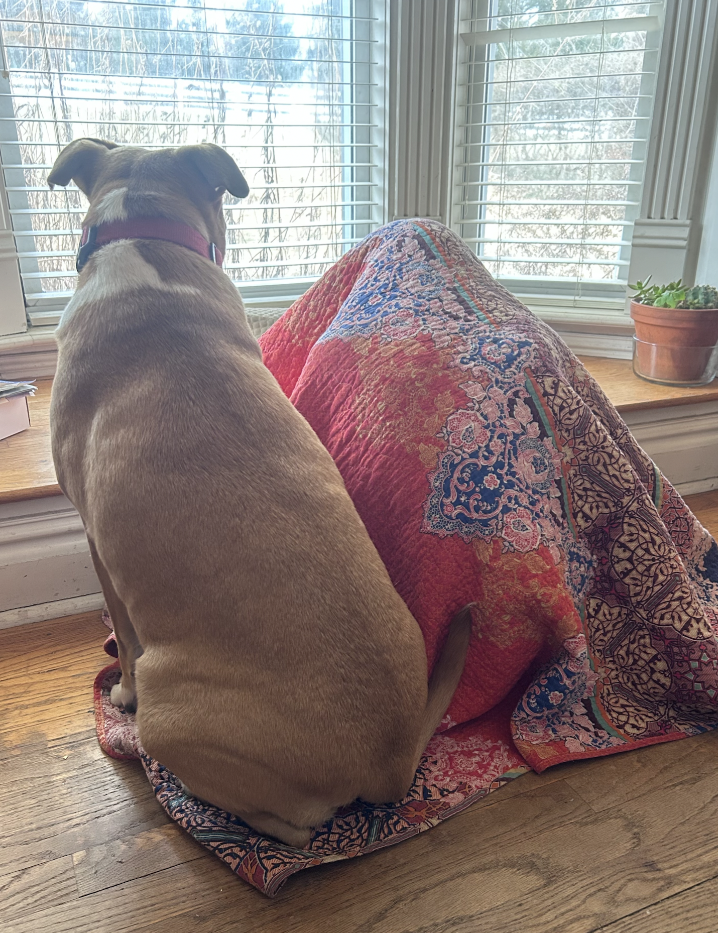 ...Puck trying to find the mouse Cheese caught last night and let escape inside his room somewhere...