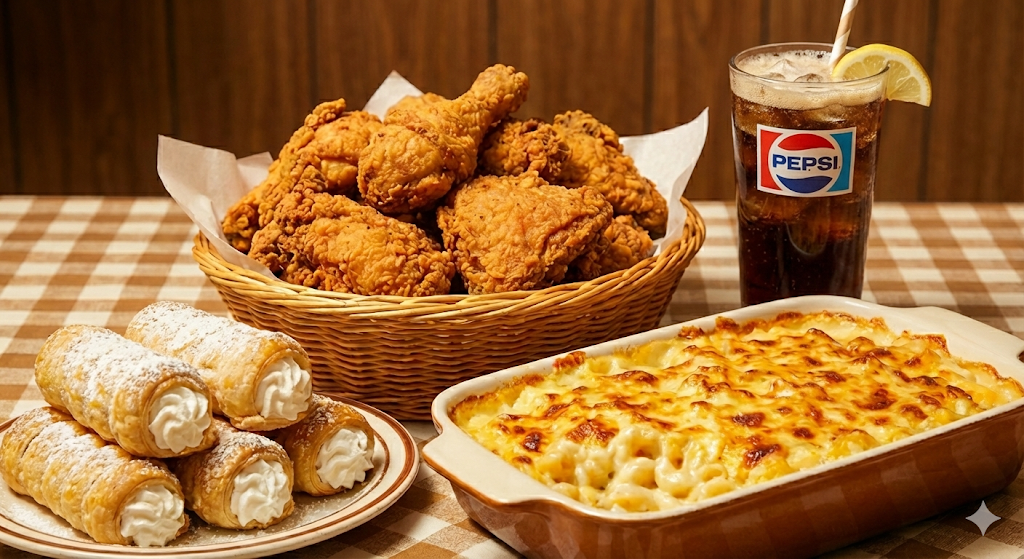 Meanwhile Oxbear is texting AI-rendered images of the secret meal pick-up I've requested for the evening including fried chicken with creamy mac 'n cheese and a Pepsi of course... with cream horns for dessert...